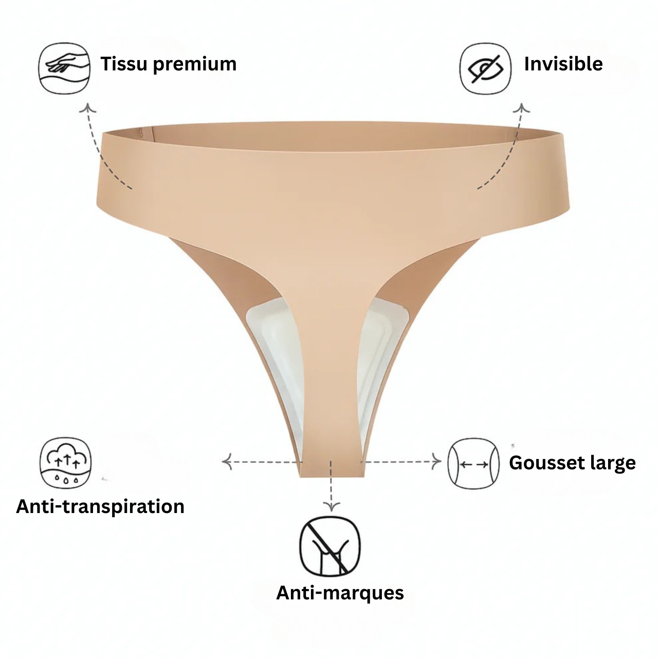 Notre string met fin aux marques gênantes, aux traces de transpiration et aux sous-vêtements qui se voient sous vos leggings. Même sous les plus moulants !
